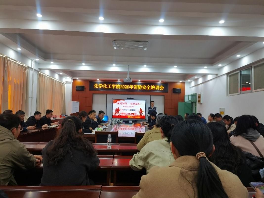 为进一步增强师生消防安全意识,提升火灾防控与应急处置能力,3月25日下午,化学化工学院在综合实验楼D308举办2026年消防安全培训会。学院党委书记许光日、院长杨理及领导班子成员出席,全体教师参加培训。